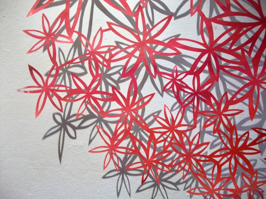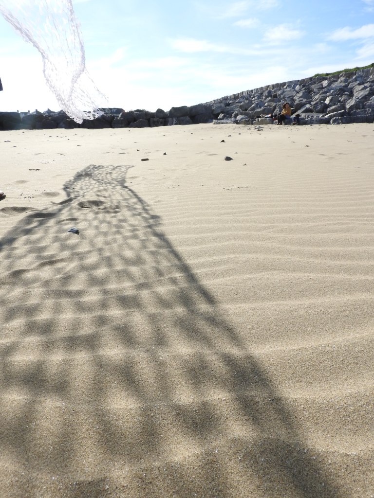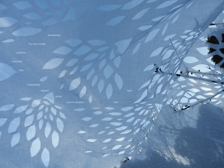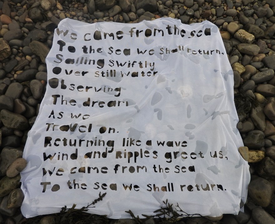 I investigate the use of light and shadow in my work, which the cut out method also works well with. I often situate my work in the natural environment which creates exciting and unpredictable collaborations with forces of nature. I record these interactions with film and photography. An area of research for me is how we can use language, symbols and art to connect us to nature. My research explores the animistic and powerful nature of words and their potential for aiding re-connection to nature through collaboration between language and forces of nature. I am also researching the ‘re-wilding’ of the human through art and language. I explore this by making films where language is combined with my art work interacting with natural forces to create unexpected metaphors, meanings and connections.