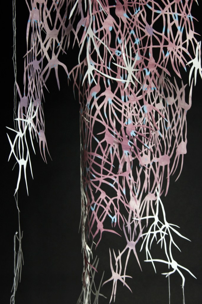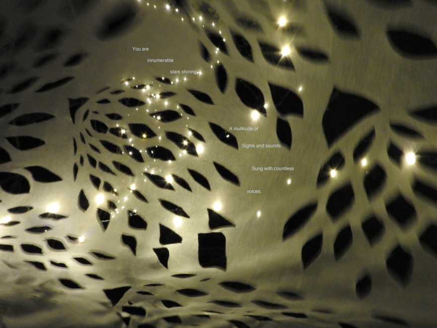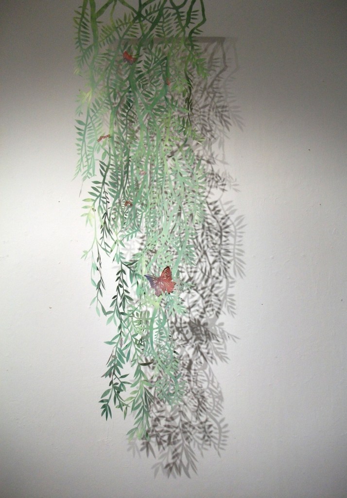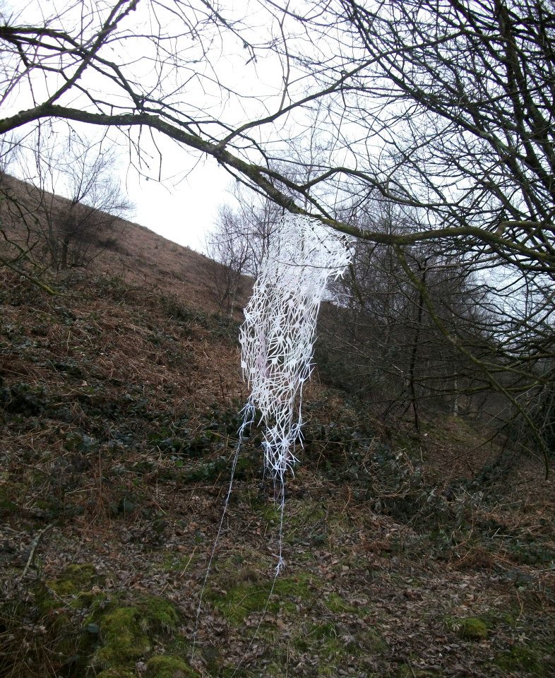 Hello! I’m Lou Thomas and I am a Cardiff based artist. I graduated from Cardiff School of Art and Design in 2017 with a 1st class (hons) degree in Illustration and I graduated with an M.A in Illustration and Animation, acheiving a Distinction, also at Cardiff School of Art and Design. I work intuitively with a wide variety of materials from paper, fabric, plaster, paint and latex to bark, leaves, branches, water and the wind. I try to keep my materials as natural and raw as possible and carefully consider the appropriate material for each piece of work. Which ever material I use I work a lot with cut outs, this enables my work to be entangled with nature and for the natural world to be seen through the work. Using cut outs also creates the opportunity for language to be immersed in natural surroundings which I use to explore how this creates a connection between written language and the living world.
